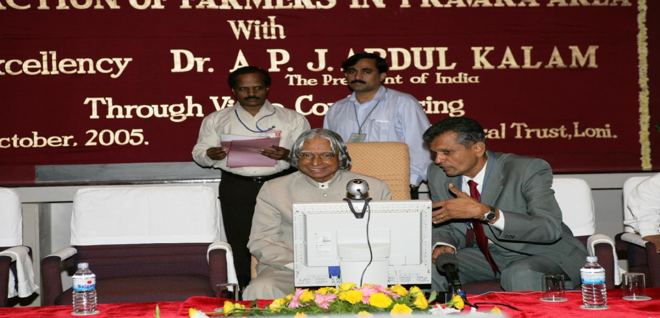 The President of India, Dr A P J Abdul Kalam interacting with the Farmers through Video Conference and planting a sapling during his visit to Pravara Medical Trust, Loni District of Ahmednagar in Maharashtra on Oct 15, 2005