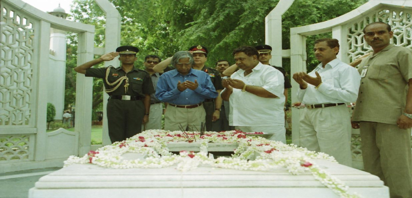 The President of India, Dr A P J Abdul Kalam paying homage to the President of India, Late Shri Giani Zail Singh at Ekta Sthal in New Delhi on July 26, 2002