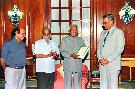 The President of India, Shri K R Narayanan receiving a copy of the Book Medieval Indian Literature an Anthology by the President Sahitya Academy, Shri Ramakanta Rath at the Committee Room of Rashtrapati Bhavan in New Delhi on July 17, 1998