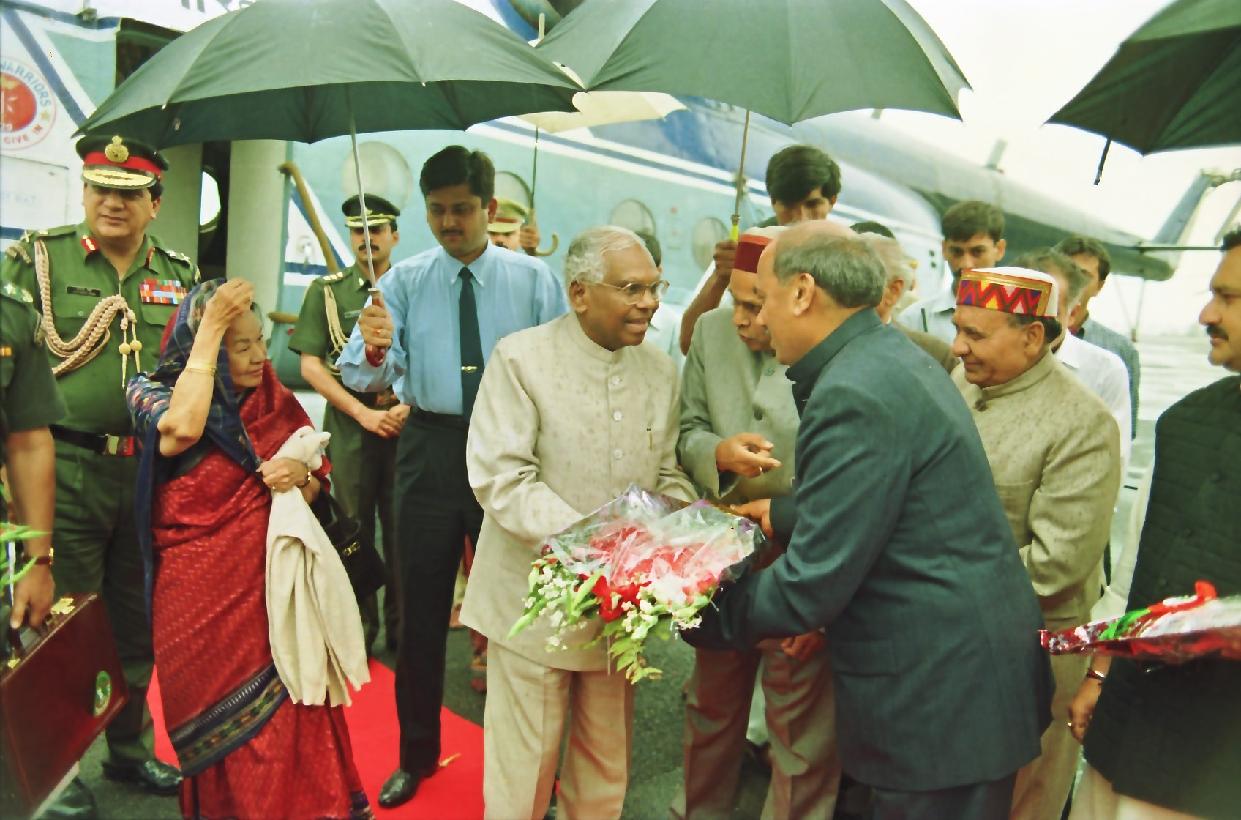 The President of India, Shri K R Narayanan being received by the Chief Minister of Himachal Pradesh, Shri Prem Kumar Dhumal at Kalyani Helipad at Shimla in Himachal Pradesh on June 10, 1998