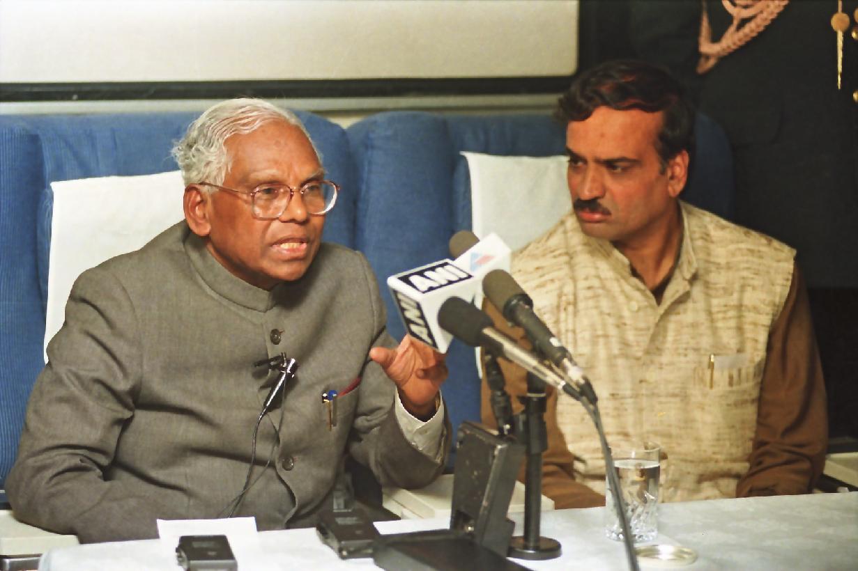 The President of India, Shri K R Narayanan interacting with the Media onboard after his State visit of Peru and Brazil on May 09, 1998