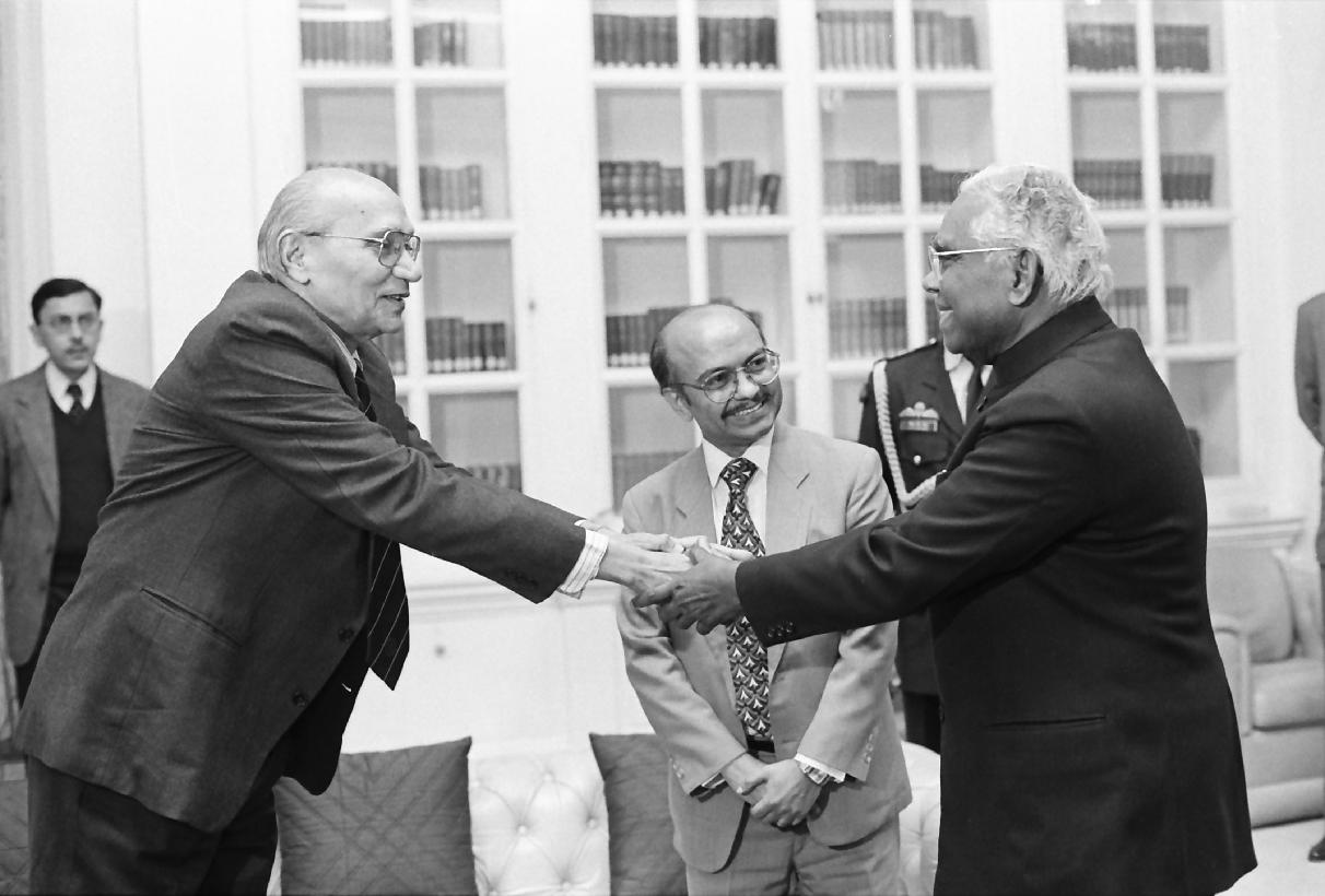 The Foreign Minister of Sri Lanka, HE Mr Lakshman Kadirgamar calling on the President of India, Shri K R Narayanan at the Morning Room of Rashtrapati Bhavan in New Delhi on Dec 24, 1997