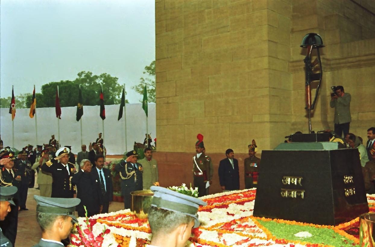 The President of India, Shri K R Narayanan laying a wreath at Amar Jawan Jyoti on Vijay Diwas at India Gate in New Delhi on Dec 16, 1997