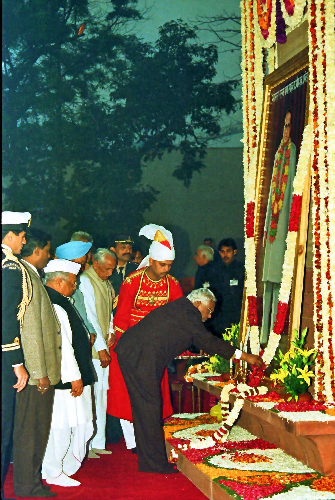 The President of India, Shri K R Narayanan paying homage at the Statue of Dr Rajendra Prasad on his 113th Birth Anniversary at Parliament House Annexe in New Delhi on Dec 03, 1997