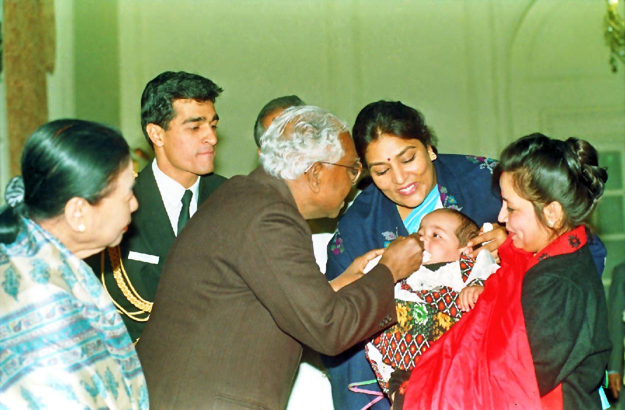 The President of India, Shri K R Narayanan inaugurating the Pulse Polio Campaign by administering the Polio Drop to Children at the Yellow Drawing Room of Rashtrapati Bhavan in New Delhi on Dec 06, 1997