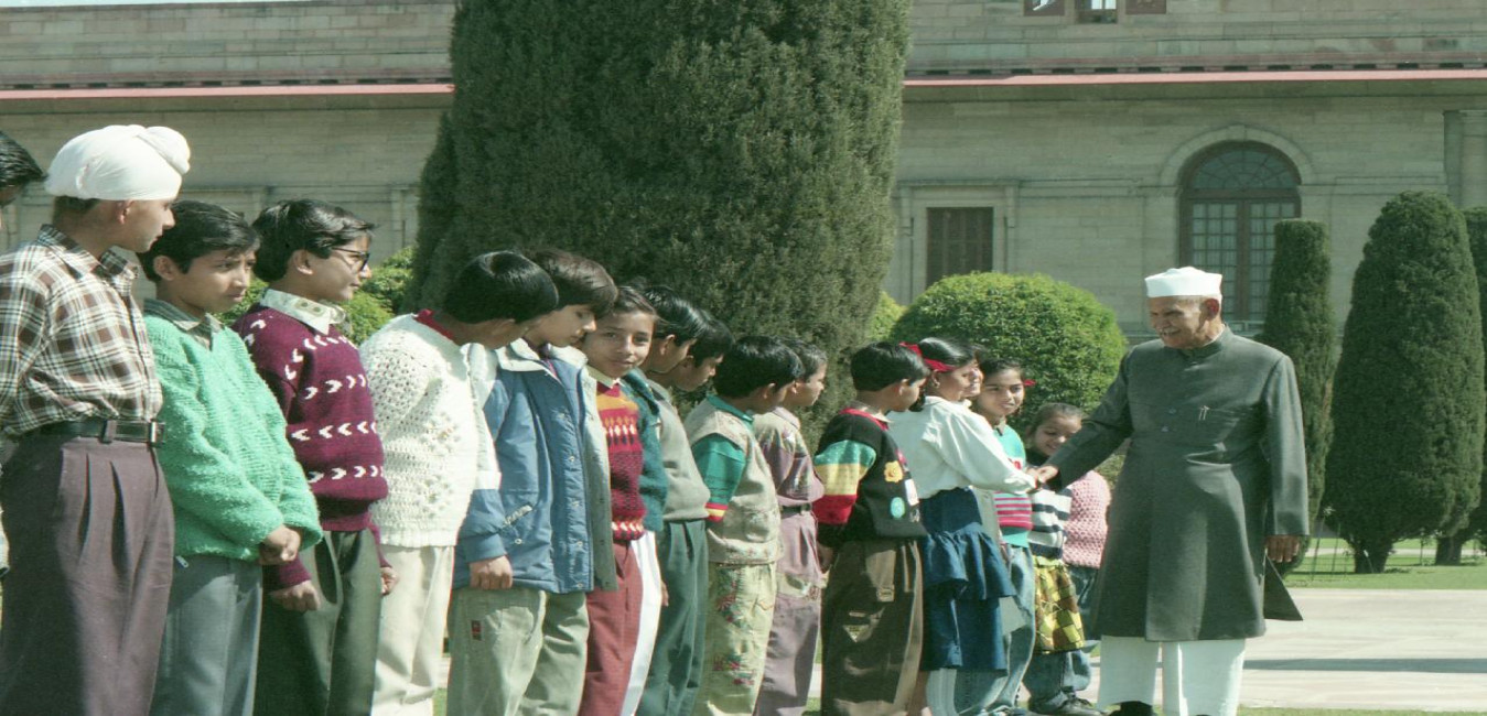 The President of India, Dr. Shankar Dayal Sharma meeting with a group of children at Mughal Garden in New Delhi on February 12, 1997.