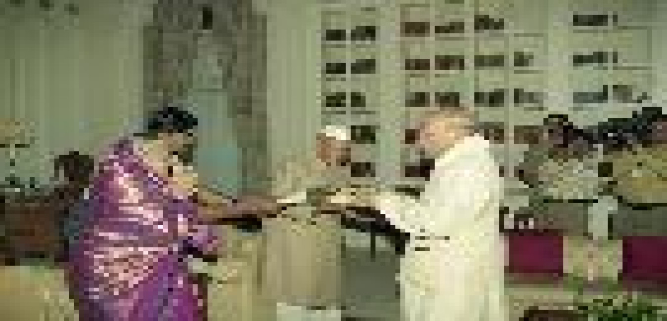 The President of India, Dr. Shankar Dayal Sharma presenting Bharat Ratna Rajiv Gandhi Sadbhavana Puraskar-96, at Rashtrapati Nilayam, Hyderabad on November 06, 1996.