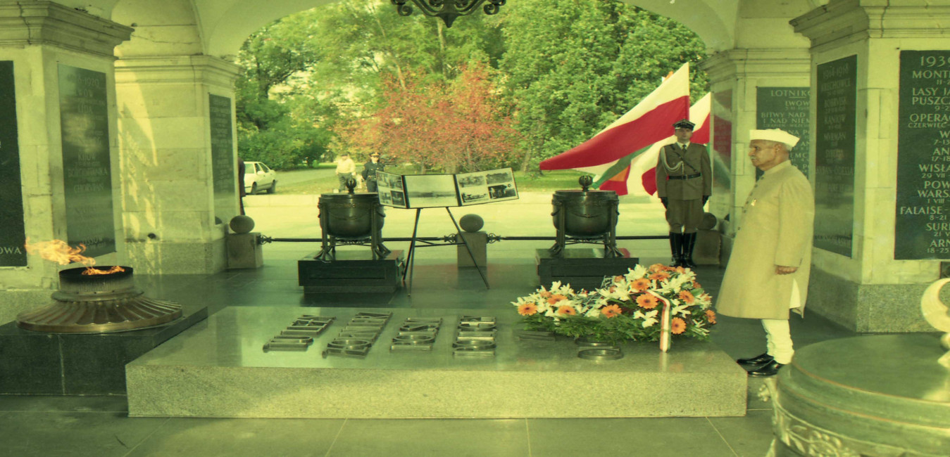 The President of India, Dr. Shankar Dayal Sharma laying wreath at the Monument of the Unknown Soldier, at Pilsudski Square, Warsaw, in Poland on October 07, 1996.
