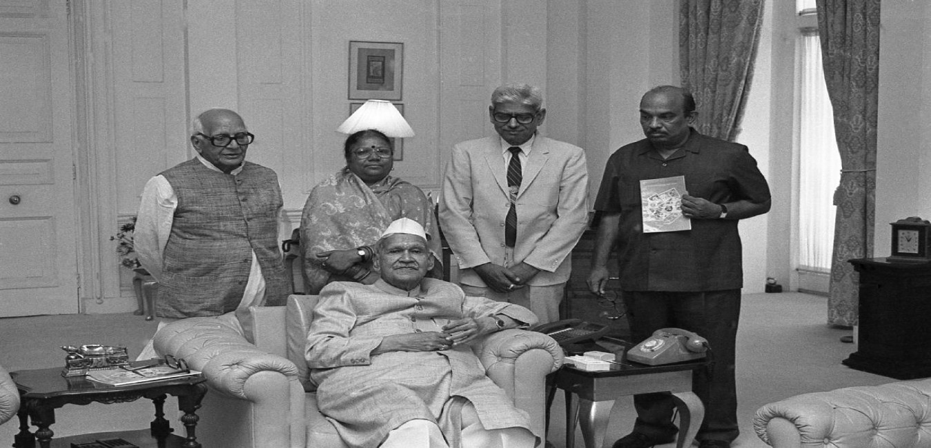 The President of India, Dr. Shankar Dayal Sharma receiving a copy of the book from Dr. S.K. Bhat with others at Rashtrapati Bhavan in New Delhi on April 09, 1996.