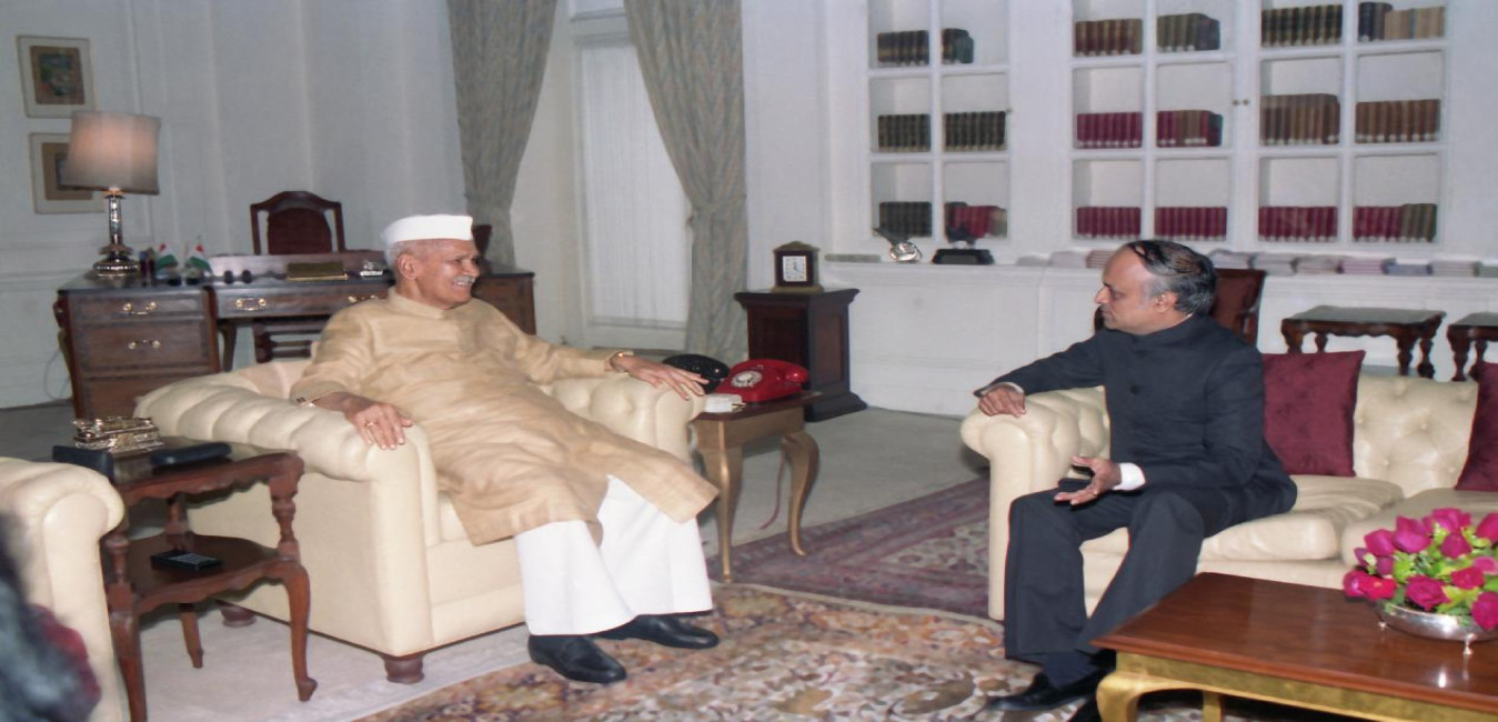 The President of India, Dr. Shankar Dayal Sharma meeting with H.R.H. Dipendra Bir Bikram Shah Dev, Crown Prince of Nepal at Rashtrapati Bhavan in New Delhi on August 31, 1994.