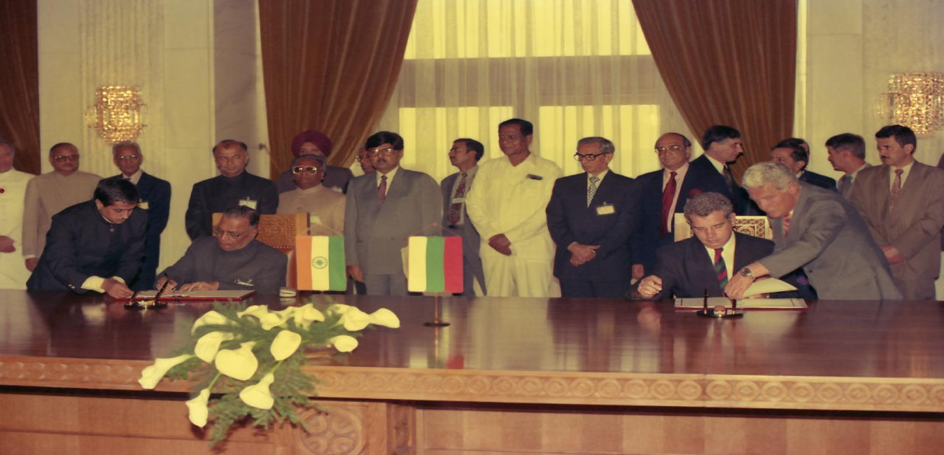 The President of India, Dr. Shankar Dayal Sharma and the President of Bulgaria, Mr. Zhelyu Zhelev, witnessing the signing of agreements, at Boyana, Sofia, in Bulgaria on May 26, 1994.