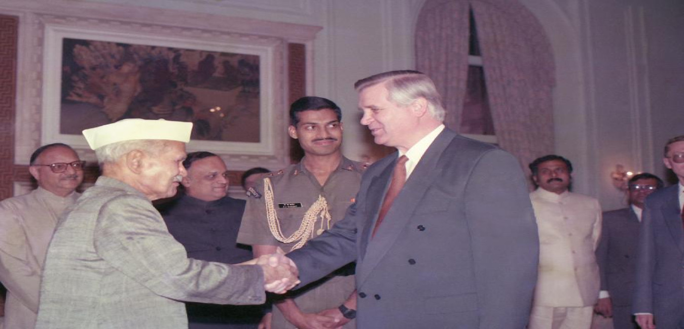 The President of India, Dr. Shankar Dayal Sharma meeting with H.E. Mr. Anatoly Maximovich Zlenko, Foreign Minister of Ukraine at Rashtrapati Bhavan in New Delhi on April 20, 1994.