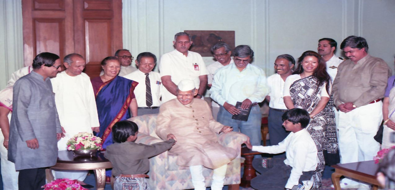 The President of India, Dr. Shankar Dayal Sharma meeting with Shri Salim Durani with others at Rashtrapati Bhavan in New Delhi on March 30, 1994.