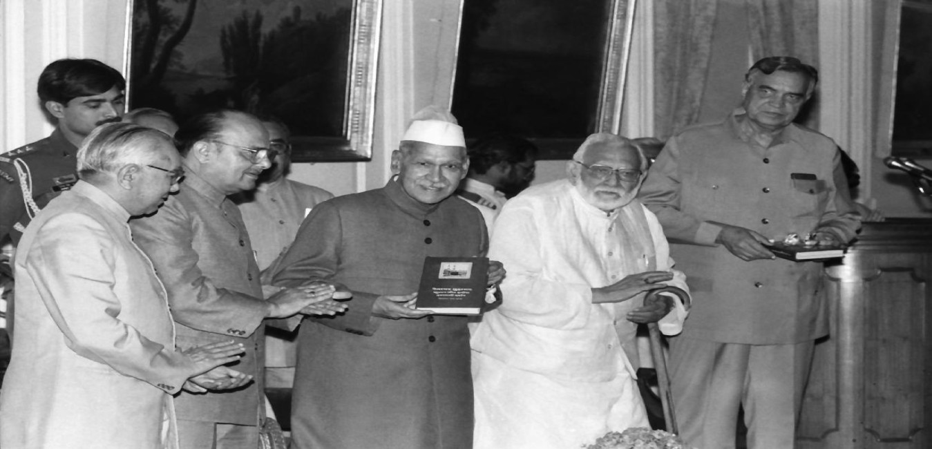 The President of India, Dr. Shankar Dayal Sharma receiving a copy of the book "Bharatiya Adhunik Rajbhasha: Swarup Aur Samasyain" of Dilip Kumar Chauhan of Indore at Rashtrapati Bhavan in New Delhi on March 22, 1994.