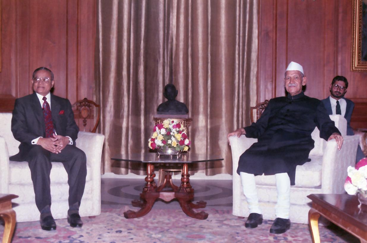 The President of the Republic of Maldives, H.E. Mr. Maumoon Abdul Gayoom calling on the President of India, Dr. Shankar Dayal Sharma, at Rashtrapati Bhavan in New Delhi on March 21, 1994.
