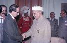 The President of India, Dr. Shankar Dayal Sharma receiving a copy of the book from Shri Surindra Chatima at Rashtrapati Bhavan in New Delhi on January 13, 1994.
