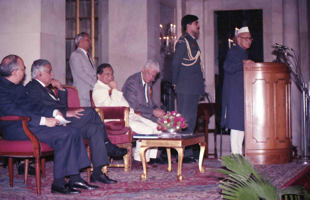 The President of India, Dr. Shankar Dayal Sharma receiving a copy of the book from Dr. Panchal with others at Rashtrapati Bhavan in New Delhi on January 05, 1994.