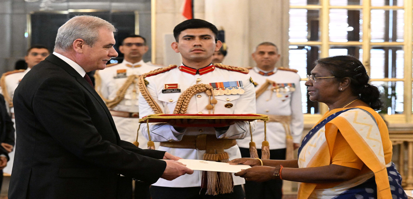 The Ambassador-Designate of Hungary, H.E. Mr. Istvan Szabo presenting his credentials to the President of India, Smt Droupadi Murmu at Ashok Hall of Rashtrapati Bhavan in New Delhi on March 24, 2023