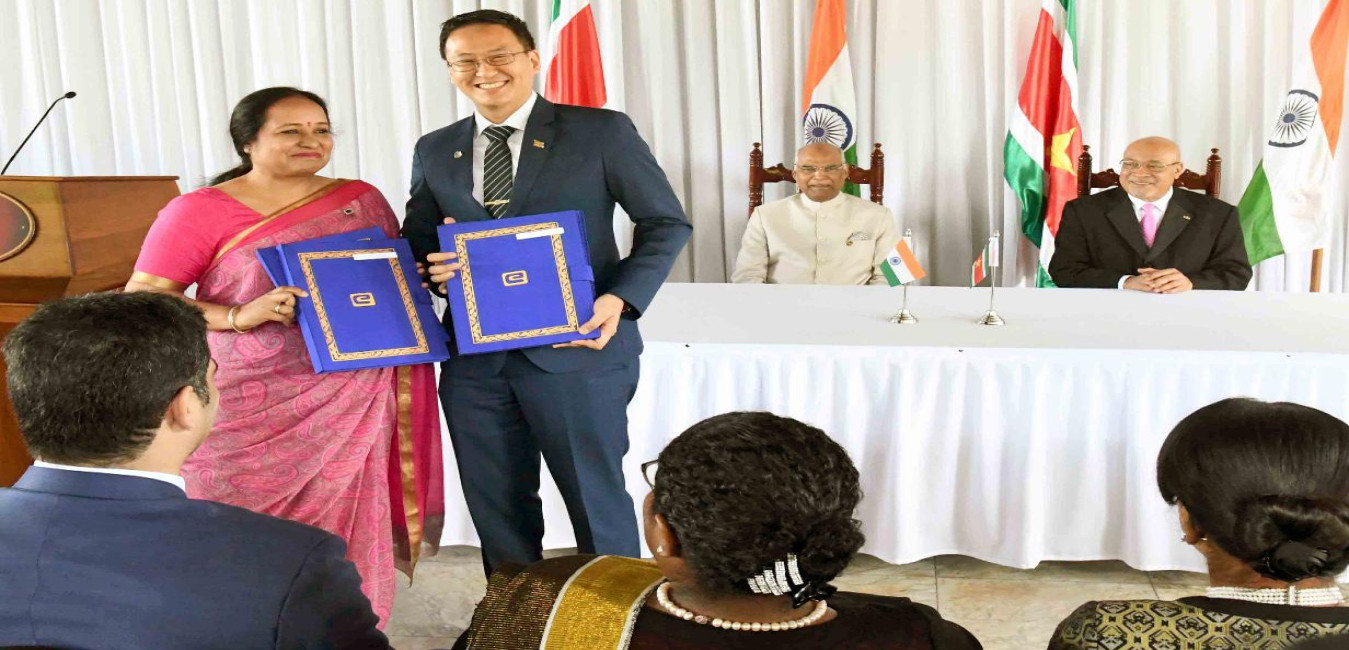 The President of India, Shri Ram Nath Kovind and the President of the Republic of Suriname, H.E. Mr. Desire Delano Bouterse witnessing the exchange of documents of Various Agreements between India and Suriname and delivering Press Statements, at Presidential Palace, in Suriname on June 20, 2018.
