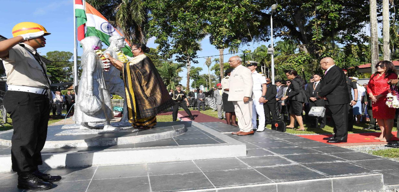 The President of India, Shri Ram Nath Kovind garlanding the Statues of Baba and Mai (the symbolic memorial of the arrival of Indian immigrants in Suriname in 1873), in Suriname on June 20, 2018.