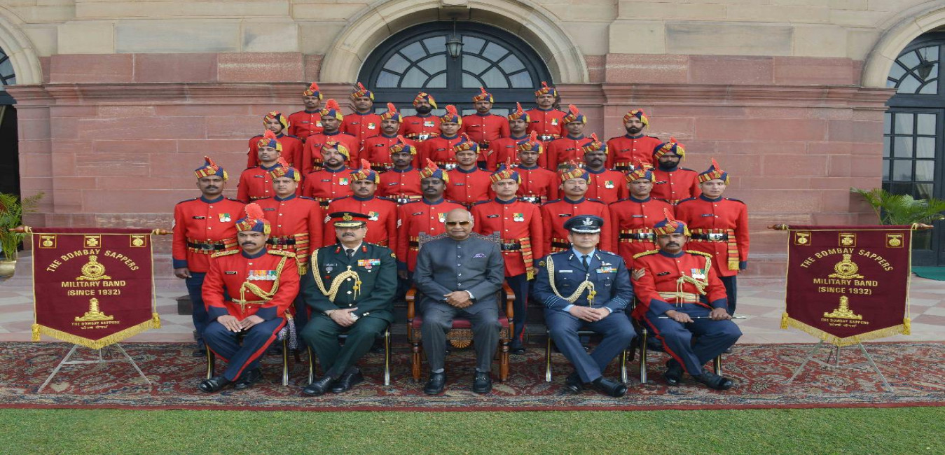 The President of India, Shri Ram Nath Kovind in a Group Photograph with the Military Band of BEG & Centre Kirkee Pune, at Rashtrapati Bhavan on December 29, 2017.