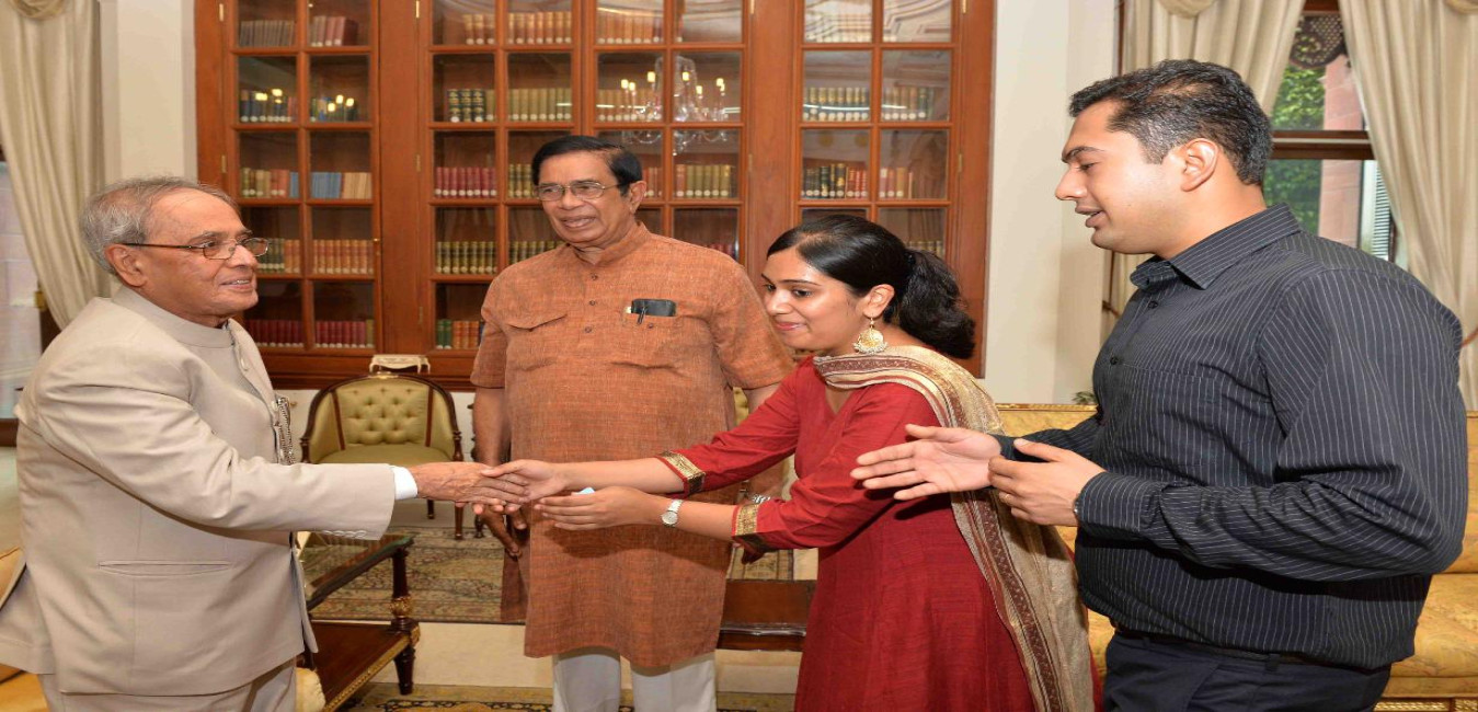 The President of India, Shri Pranab Mukherjee meeting with Dr. Devolina Sikdar alongwith her son Shri Sushmit Sikdar, at Rashtrapati Bhavan, in New Delhi on August 22, 2015.