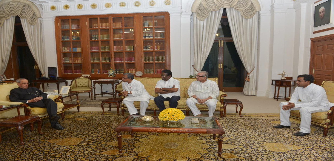 The President of India, Shri Pranab Mukherjee meeting with Shri Mulayam Singh Yadav, MP (LS), at Rashtrapati Bhavan, in New Delhi on August 19, 2015.