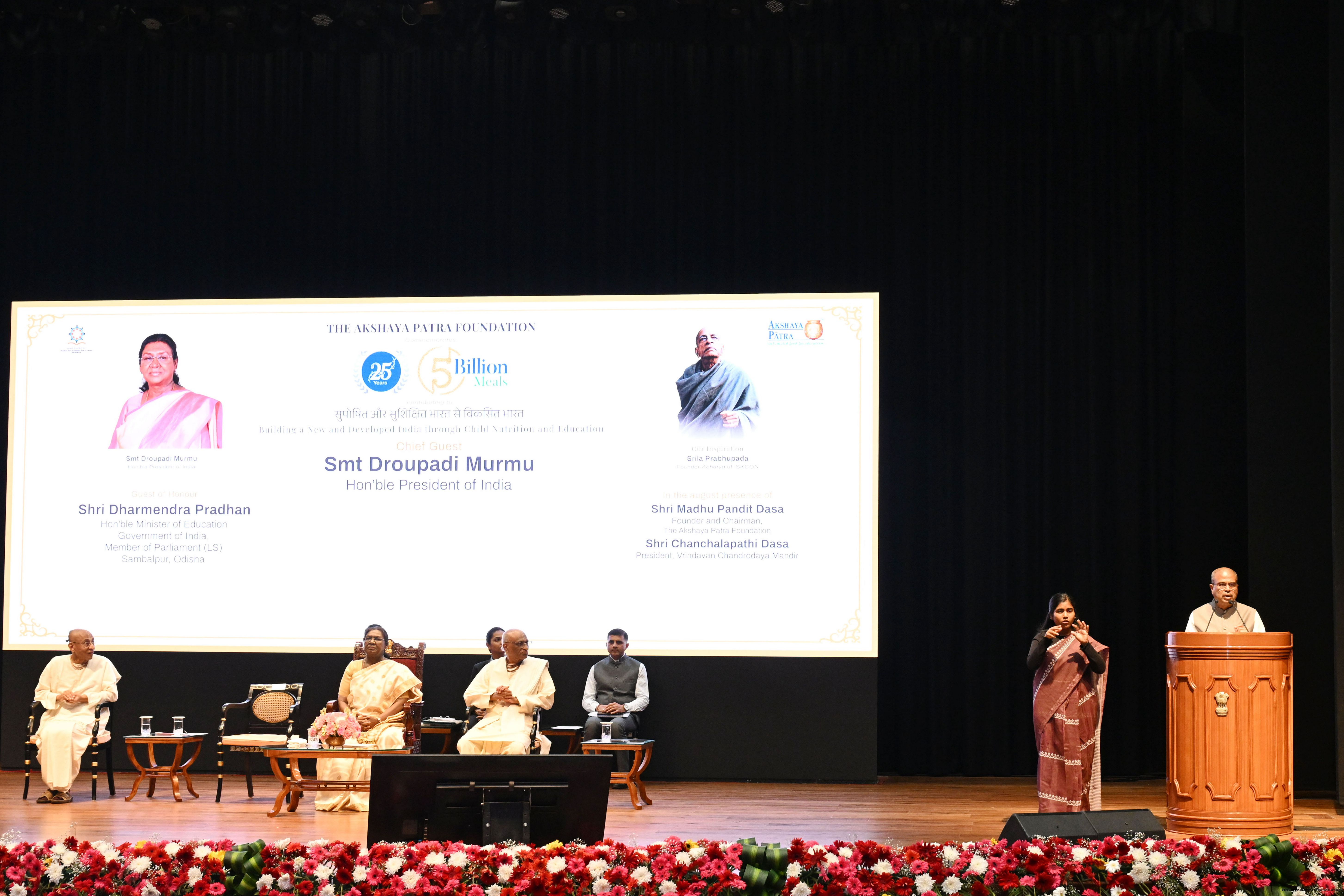 The President of India Smt Droupadi Murmu graced an event to commemorate the five billion meals of Akshaya Patra Foundation at Rashtrapati Bhavan Cultural Centre on March 17, 2026.