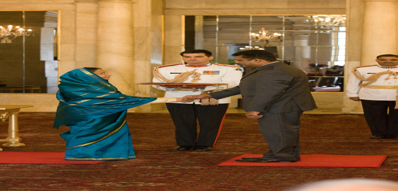 The High Commissioner of Fiji, His Excellency Mr Yogesh Karan presenting his Credentials to the President of India, Smt Pratibha Devisingh Patil at Rashtrapati Bhavan in New Delhi on Nov 01, 2011