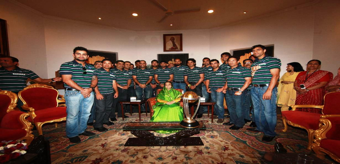 The President of India, Smt Pratibha Devisingh Patil interacting with the victorious Indian Cricket Team after they won the World Cup Cricket with their Family Members at Raj Bhavan of Mumbai in Maharashtra on April 03, 2011