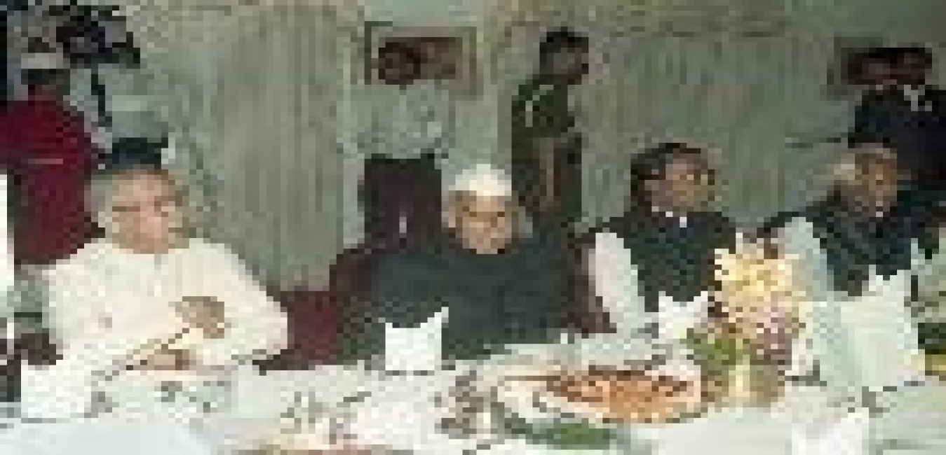 The President of India, Dr. Shankar Dayal Sharma at the dinner hosted by the Governor, Madhya Pradesh, Mohammad Shafi Qureshi, at Bhopal on February 27, 1997. Smt. Vimala Sharma and Chief Minister, Madhya Pradesh, Shri Digvijaya Singh are also seen.