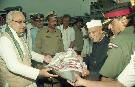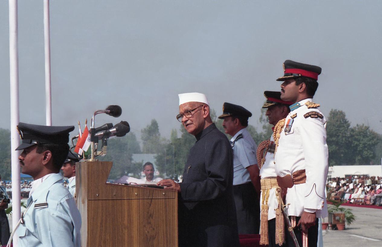 The President of India, Dr. Shankar Dayal Sharma presenting Standards to 27 Sqn and 114 HU of Indian Air Force and reviewing the Parade, at Gorakhpur, Uttar Pradesh on November 13, 1996.