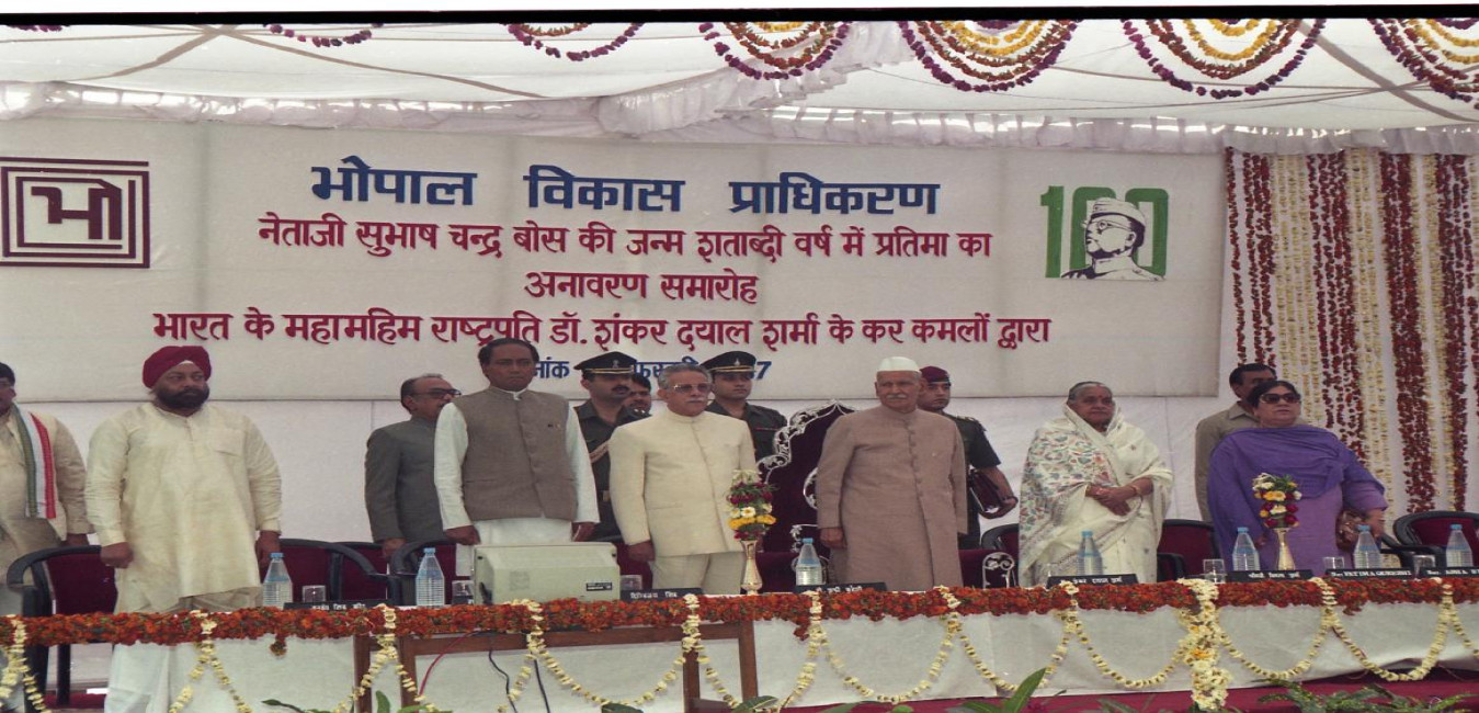 The President of India, Dr. Shankar Dayal Sharma unveiling the Statue of Netaji Subhash Chandra Bose at Bhopal on February 28, 1997. Smt. Vimala Sharma, the Governor, Madhya Pradesh, Mohammad Shafi Qureshi and Chief Minister, Madhya Pradesh, Shri Digvijaya Singh are also seen.