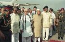 The President of India, Dr. Shankar Dayal Sharma being received by the Governor of Andhra Pradesh, Shri Krishan Kant and the Chief Minister, Andhra Pradesh, Shri N. Chandrababu Naidu, at Hyderabad airport on April 14, 1997.