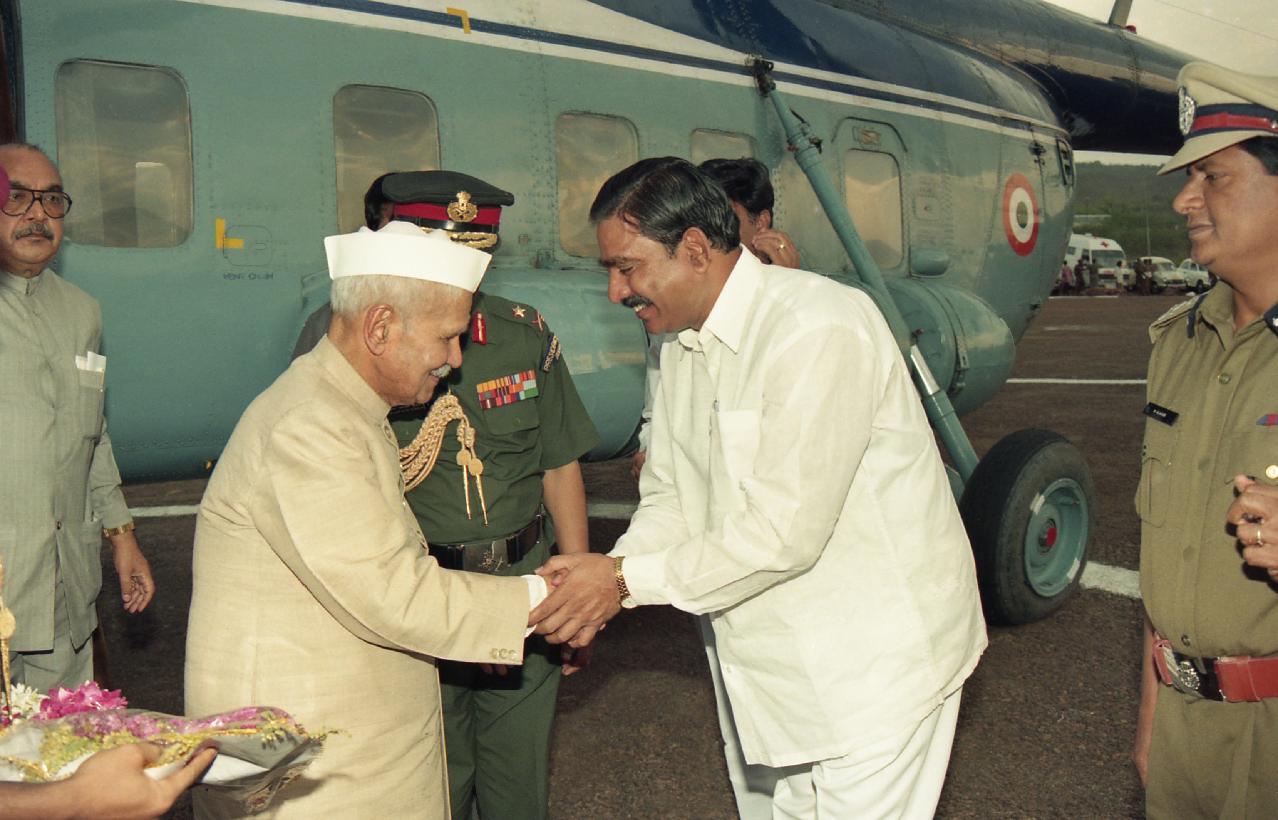 The President of India, Dr. Shankar Dayal Sharma arrives at Sundipenta Helipad, Srisailam on April 14, 1997.