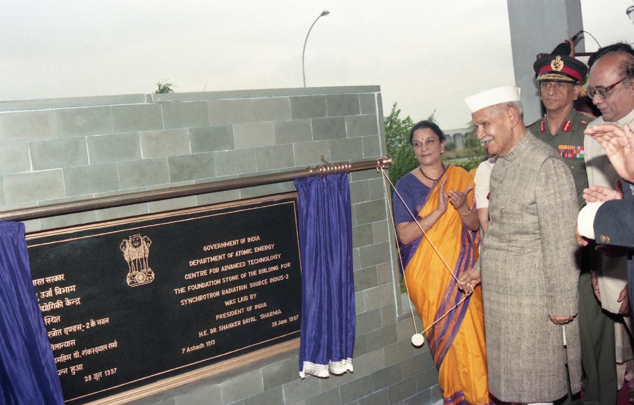 The President of India, Dr. Shankar Dayal Sharma unveiling the plaque to lay the foundation stone of INDUS-2 and visits the Centre for Advanced Technology, at Indore, Madhya Pradesh on June 28, 1997.