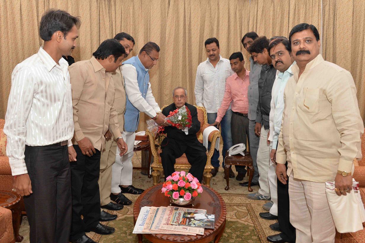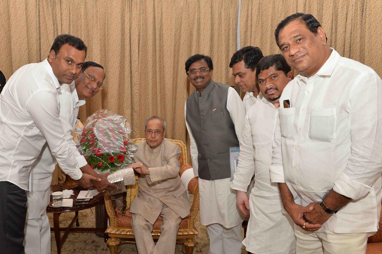 The President of India, Shri Pranab Mukherjee meeting with Shri Ponnam Prabhakar with others, at Rashtrapati Nilayam, Bolarum, in Secunderabad on December 21, 2015.