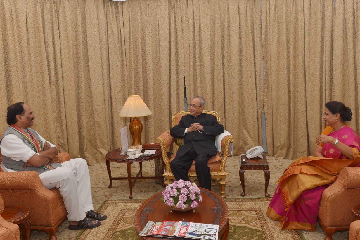 The President of India, Shri Pranab Mukherjee meeting with Shri Uttam Kumar Reddy, President, Telangana Pradesh Congress Committee alongwith his wife, at Rashtrapati Nilayam, Bolarum, in Secunderabad on December 23, 2015.