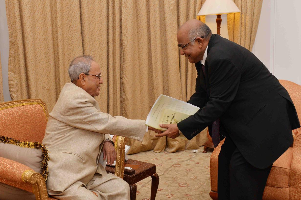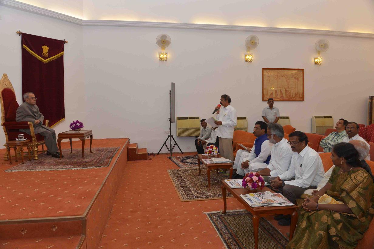 The President of India, Shri Pranab Mukherjee meeting with Dr. A. Chakrapani with others, at Rashtrapati Nilayam, Bolarum, in Secunderabad on December 26, 2015.