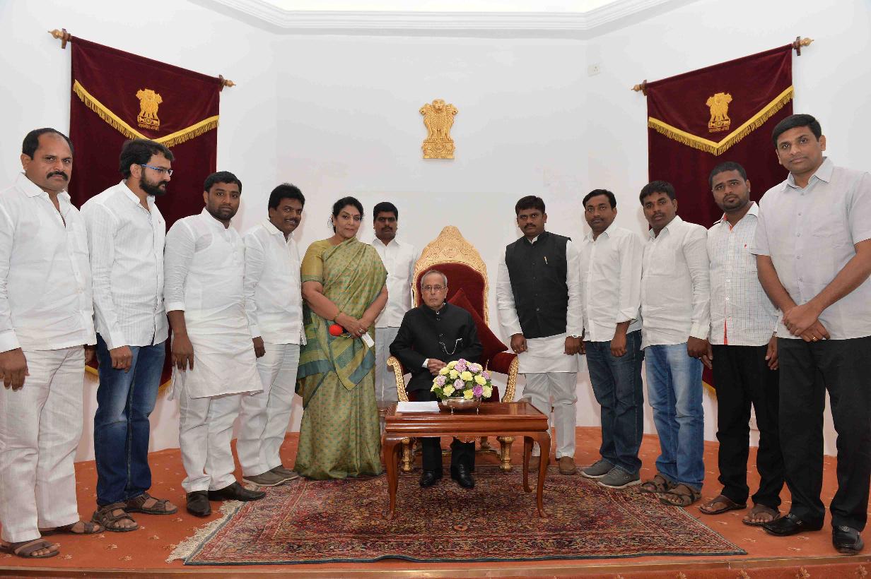 The President of India, Shri Pranab Mukherjee meeting with Smt. Renuka Chowdhury, MP (RS) with others, at Rashtrapati Nilayam, Bolarum, in Secunderabad on December 30, 2015.
