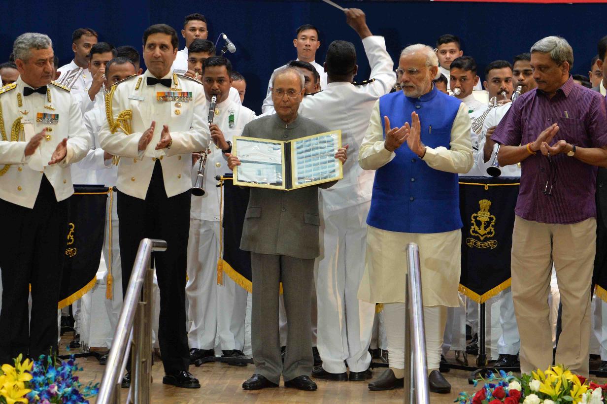 The President of India, Shri Pranab Mukherjee witnessing the International Fleet Review-2016 and Fly Past, at INS Sumitra (Presidential Yacht), in Visakhapatnam on February 06, 2016. The President is received by the Prime Minister of India, Shri Narendra Modi on the occasion.