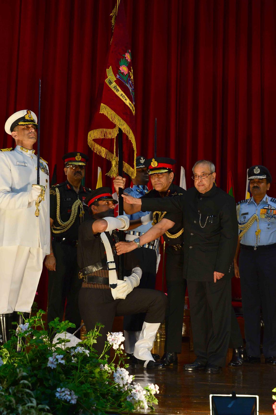 The President of India, Shri Pranab Mukherjee presenting the Presidential Colours to the Defence Services Staff College, at Wellington, Nilgiris in Tamil Nadu on September 09, 2016.