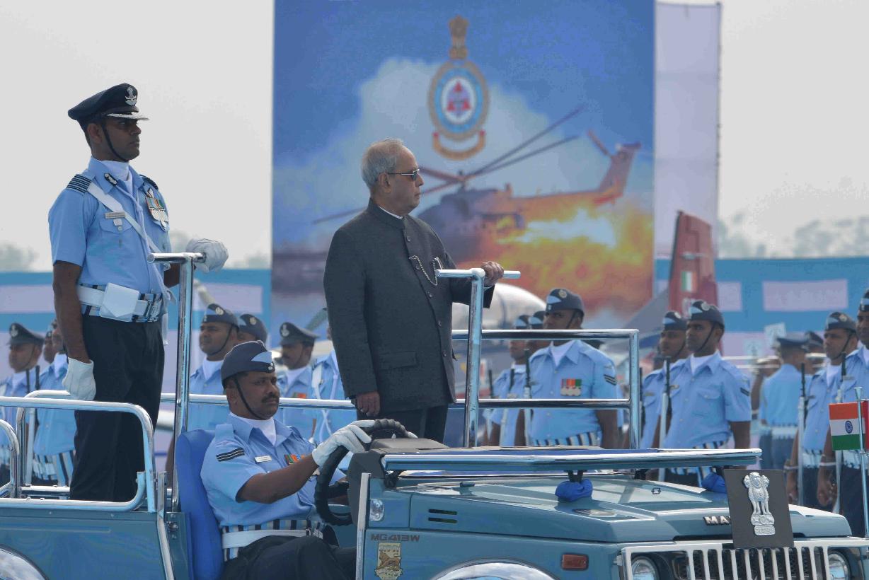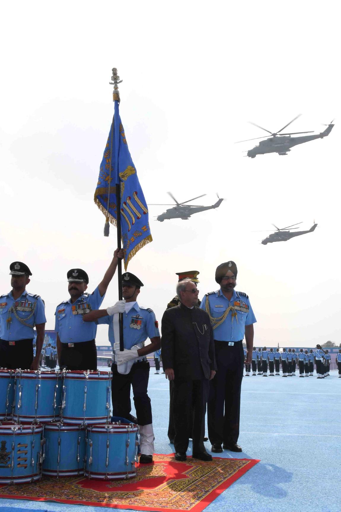 The President of India, Shri Pranab Mukherjee at the presentation of the Standard to 125 (H) Sqn and Colours to MTI of Indian Air Force, at AF Station, Tambaram, in Tamil Nadu on March 03, 2017.