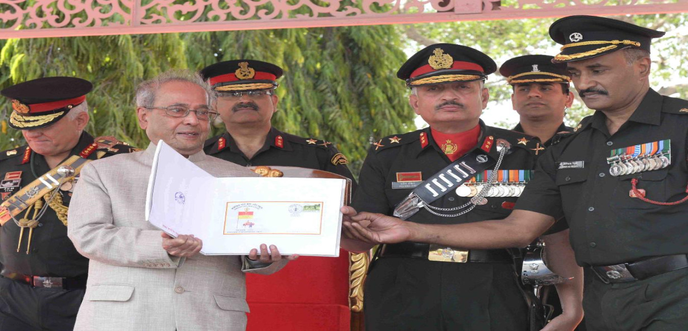 The President of India, Shri Pranab Mukherjee releasing the Special Day Cover and signing Visitor's Book, at the presentation of President's Standards to Armoured Corps Centre and School Ahmednagar, at Ahmednagar, in Maharashtra on April 15, 2017.