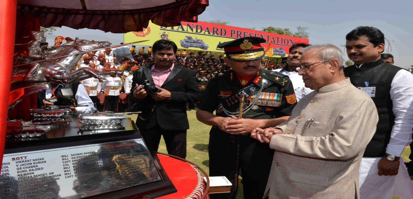 The President of India, Shri Pranab Mukherjee during the presentation of President's Standards to Armoured Corps Centre and School Ahmednagar, at Ahmednagar, in Maharashtra on April 15, 2017.