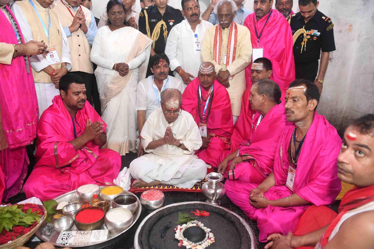 The President of India, Shri Pranab Mukherjee offering Puja at the Baba Baidyanathdham Mandir, at Deoghar, in Jharkhand on April 02, 2017.