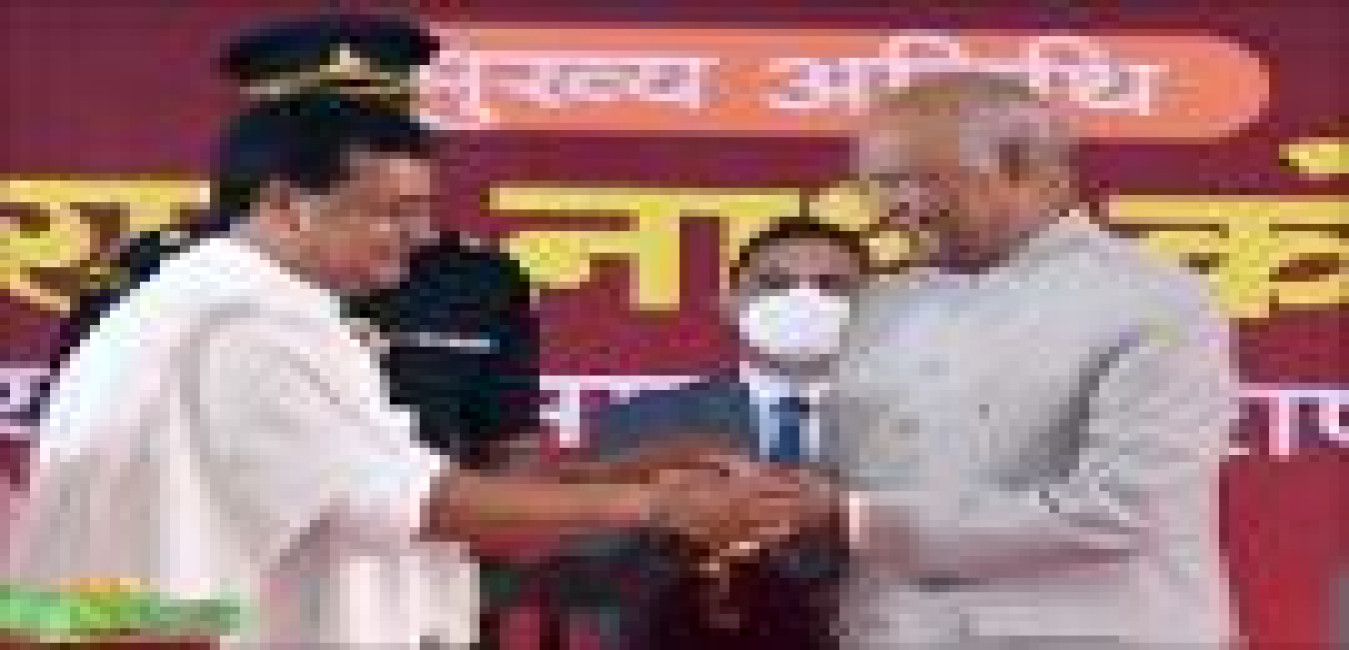 The President of India, Shri Ram Nath Kovind presents President's Colour to INS Valsura, at Jamnagar, in Gujarat on March 25, 2022.