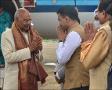The President of India, Shri Ram Nath Kovind being received by the Governor of Uttar Pradesh, Smt. Anandiben Patel and the Chief Minister, Shri Yogi Adityanath, on his arrival, in Mathura on June 27, 2022.