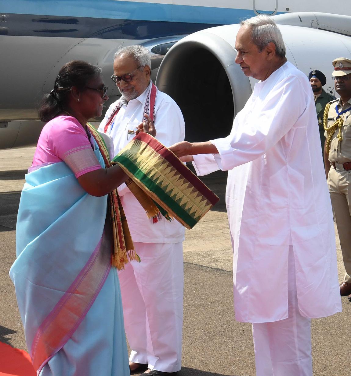 The Governor of Odisha, Prof. Ganeshi Lal, the Chief Minister, Shri Naveen Patnaik and the Union Education Minister, Shri Dharmendra Pradhan received the President of India, Smt. Droupadi Murmu on her arrival, in Bhubaneswar on February 10, 2023.