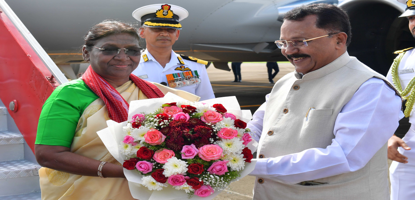 The Governor of Goa, Shri P.S. Sreedharan Pillai, Chief Minister, Dr. Pramod Sawant and the Union Minister of State for Tourism and Posts, Shipping and Waterways, Shri Shripad Naik received the President of India Smt. Droupadi Murmu on her arrival at Dabolim airport, Goa on August 22, 2023.